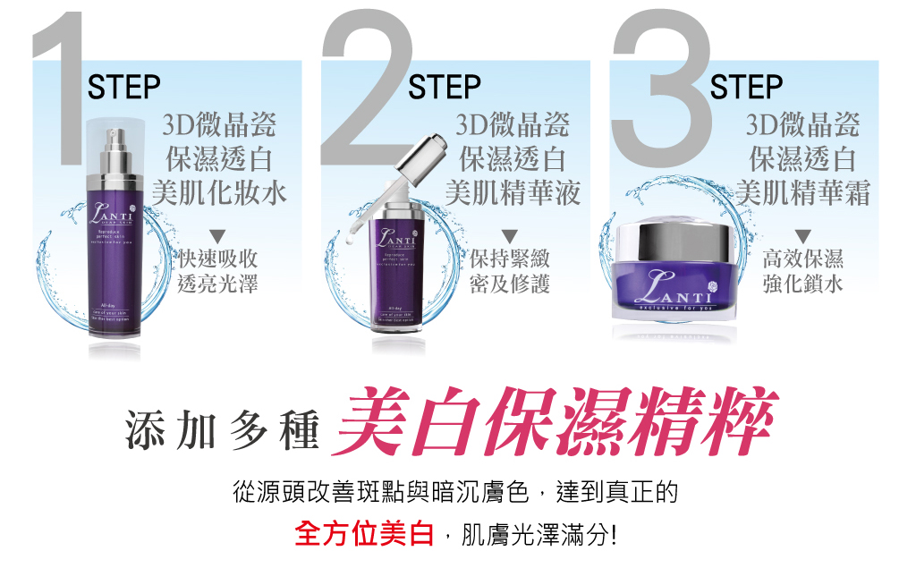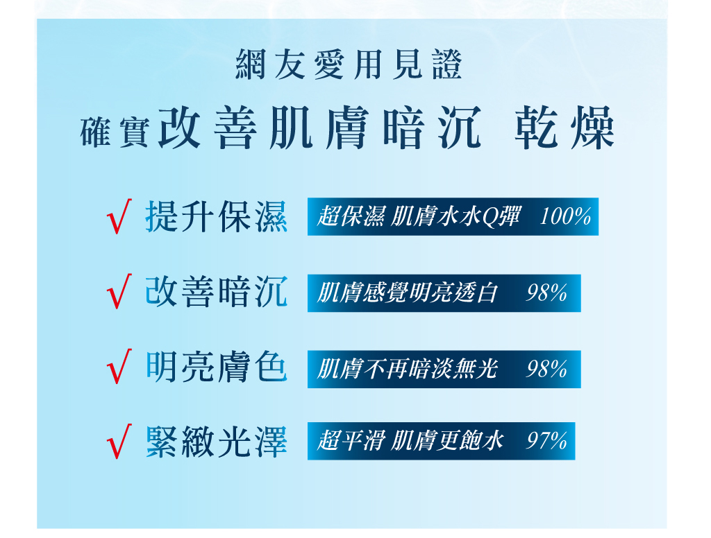 於早晚化妝水後,取適量精華液,均勻塗抹臉部及頸部,可搭配輕揉按摩至吸收。